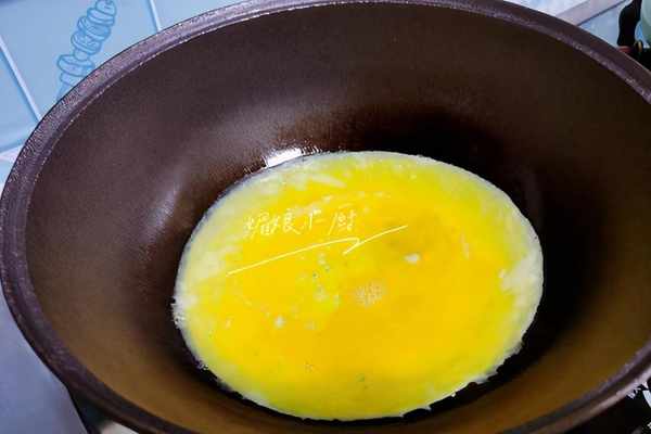 2、雞蛋1個磕入碗裡,加約10克紅薯淀粉,1小勺料酒,一點點鹽打勻蛋液,鍋加少許油,晃動下鍋讓油脂佈滿整個鍋底,中火燒熱鍋,倒入蛋液,拿起鍋轉圈晃動讓蛋液流開佈滿鍋底,小火煎10秒鐘