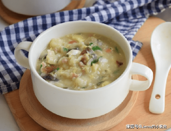 煮一分鐘後倒入皮蛋、青菜,再繼續煮兩分鐘。最後加鹽、雞精調味,這道早餐就做好瞭。