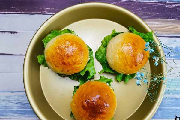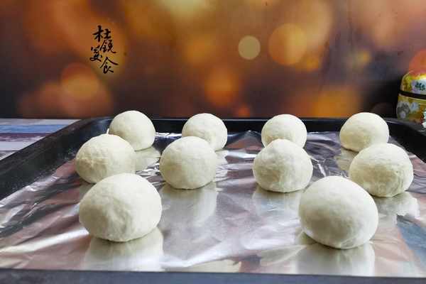 4、把面團再次揉勻,借助於手心團至表面光滑,團圓後直接擺入烤盤內,中間要保留足夠的距離,防止發酵後面團粘連在一起。烤箱底層置烤盤,倒入大半盤60度的溫水,保持面包“二次發酵”所必需的溫度與濕度。把漢堡烤盤置中層,關嚴烤箱,二次發酵35分鐘左右,至2-2.5倍大小,把漢堡胚、底層盛水烤盤一起取出。