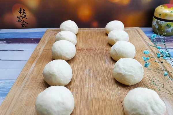3、把面團移至案板,再次揉面均勻,平均分成10份,團圓後表面蓋保鮮膜,室溫“中間發酵”15分鐘。