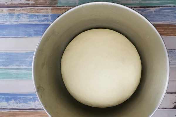 2、把面團移入發酵桶內,表面蓋保鮮膜,室溫“一次發酵”1-1.5小時,發酵至2倍大小。