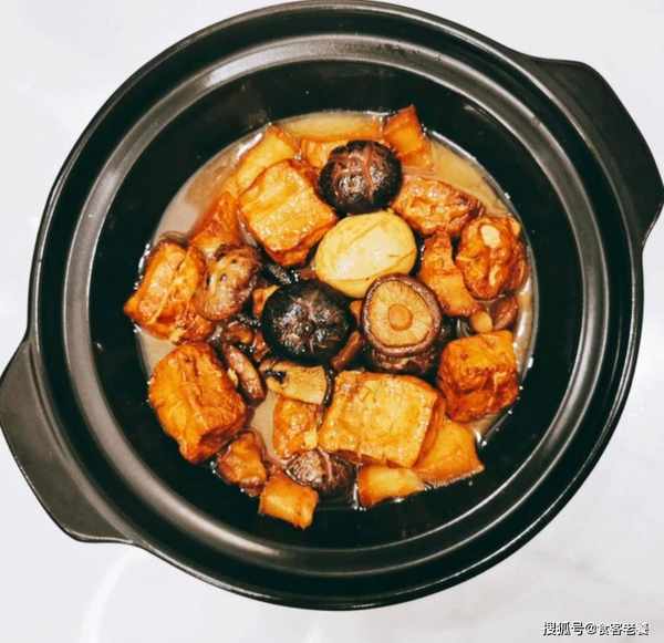6鍋中加入料酒、老抽、生抽、食料調味,加入浸泡過香菇的水浸沒所有食材後,放入砂鍋中慢燉兩個小時即可享用。