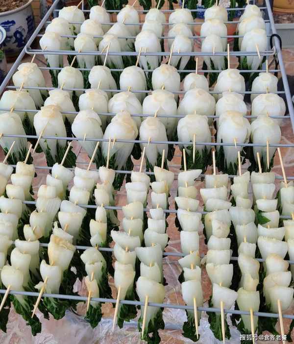 3將燙熟的白菜放入涼水中涼透,再用竹簽將白菜串在晾衣架上晾幹。