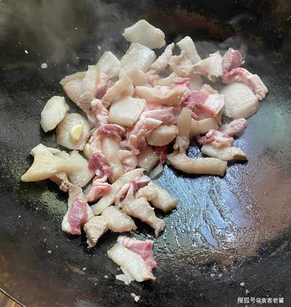 6熱鍋不放油,倒入較肥的肉煎至出油脂,下入蒜頭爆香後,再把多餘的肉倒下去炒兩分鐘盛出。