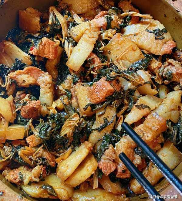 7將泡好的菜幹切碎鋪在砂鍋裡,再將爆炒好的五花腩倒在菜幹表面。倒入清水、食鹽、醬油、蠔油開大火燒開後轉小火慢燉,燒至湯汁濃稠即可出鍋。