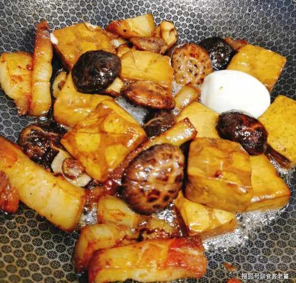 5取五香豆幹洗凈,上下各劃三刀,水煮蛋去殼劃六刀。熱鍋下油,先下入五花肉煸出油脂後盛出。鍋中留底油,下入白糖炒出糖色後放入香菇,煸炒出香味,接著下入五香豆幹和水煮蛋。