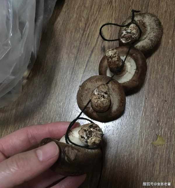 2取棉線將香菇打扣,再將香菇蒂塞進扣內系緊,待每一個香菇蒂系在一起,掛在室內透風處晾幹即可。