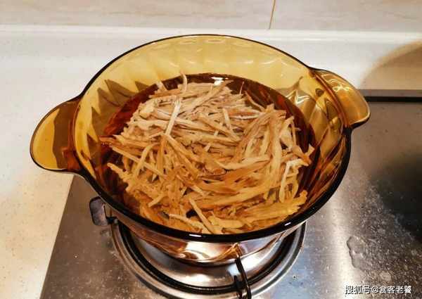 3想吃的時候,取筍幹提前一天泡軟,再將筍幹切成絲放水裡煮20分鐘。