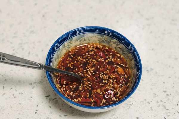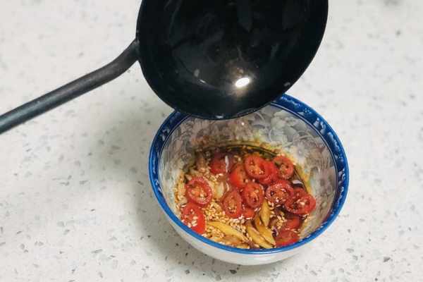 6、把準備好的調味料放入小碗裡邊,澆上一勺熱油,激發出香味的同時,降低大蒜的辛辣味,吃起來不會引發腸胃不適。