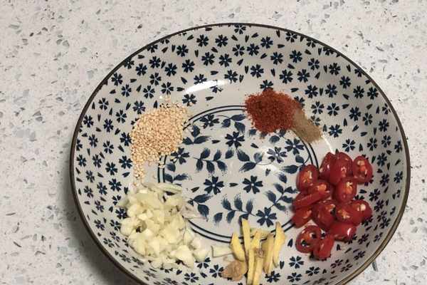 5、準備一些涼拌芹菜用到的調味料,白芝麻、花椒粉、辣椒粉、紅線椒、薑絲、蒜末。