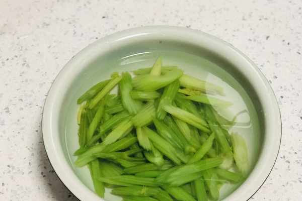4、芹菜焯水以後,迅速撈出放在涼白開裡投涼,這樣做的目的可以讓芹菜的口感變得更加清脆,而且顏色也不容易發黑。