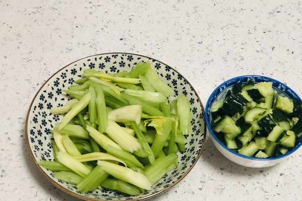 2、芹菜去掉葉子,清洗幹凈,然後把上邊的老筋去掉,斜刀切成段,可以再來一根黃瓜,黃瓜清洗幹凈拍成小塊備用。