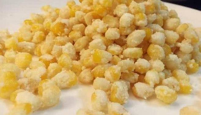 讓每顆玉米粒均勻沾滿淀粉。這是讓玉米粒成功裹住淀粉炸成脆皮的關鍵點