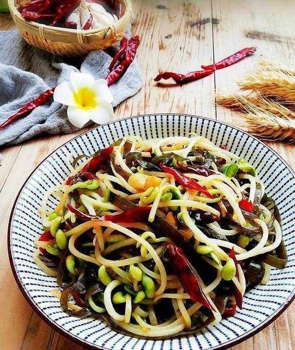 材料:綠豆芽200g海帶200g,食鹽適量醋適量生抽適量調和油適量