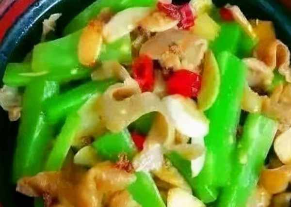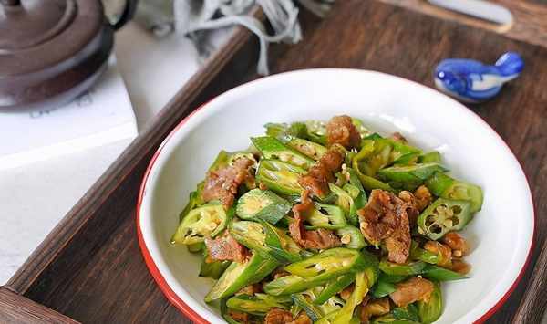 材料:梅花肉100克、秋葵200克、尖椒2個、生薑絲少許、鹽適量、生抽2茶匙、老抽數滴、淀粉少許、白糖少許