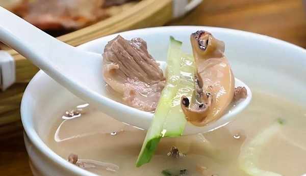 材料:墨魚幹50克、五花肉50克、瘦肉100克、黃瓜1根、白胡椒粉適量、鹽適量、薑片少許