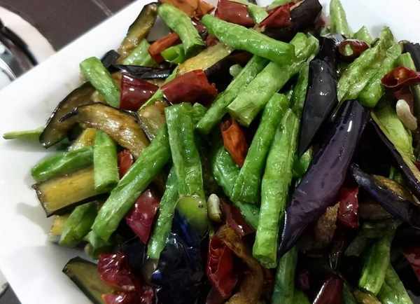 2、燒熱炒鍋,倒適量油,溫熱時放入桂皮、幹辣椒,煸炒出香味,隨後把擠幹水分的茄子、豆角放進去炒軟;3、豆角要炒時間更長一些,一定要炒熟才能吃,倒入半碗清水;