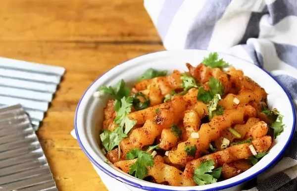 1.土豆去皮清洗幹凈,切為厚度約一厘米的片,用特制刀具切成波浪形長條。土豆切好放入清水中除去淀粉。