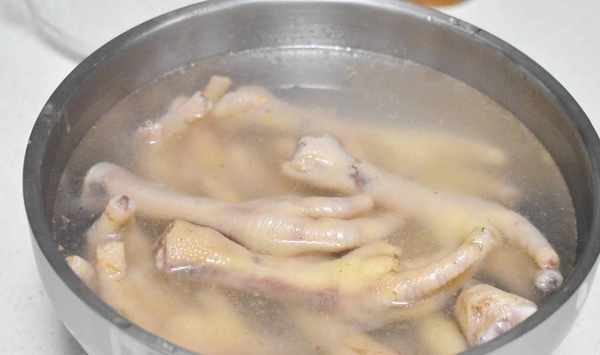第二步把鳳爪、薑片、花椒、八角、幹辣椒和料酒放入煮鍋,大火燒開後轉中火煮10分鐘。在煮鳳爪的過程中,有浮沫撈起。