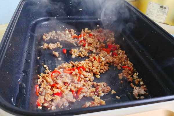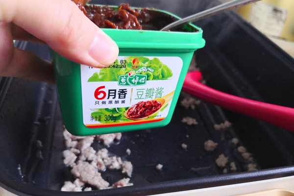 5.另起鍋,油熱後先炒豬肉餡,炒至豬肉餡變色後,加入1勺豆瓣醬和紅辣椒一起翻炒均勻,