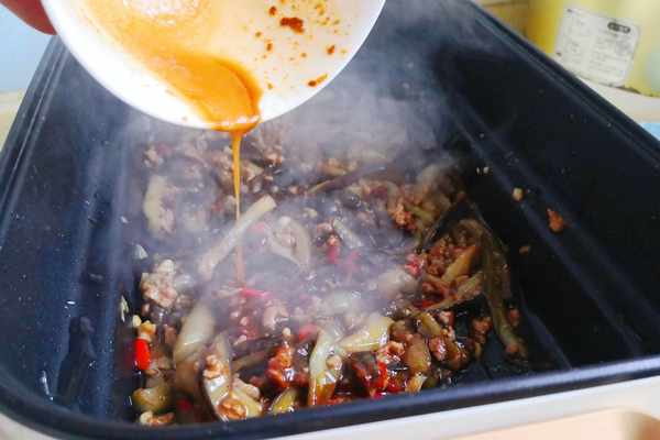 7.接下來把煎好的茄子倒入鍋中,繼續煸炒,