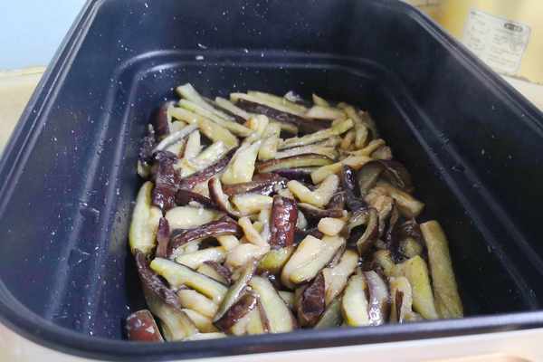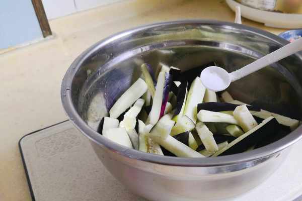 茄子在清洗幹凈,切成條之後,加1勺鹽,用手抓勻,可以利用鹽將茄子自身的水分殺出來,這樣茄子再入鍋烹飪的時候就會大大減少吸放的油瞭。再有就是烹飪的方法,也可以最大限度地減少茄子吸入的油量。