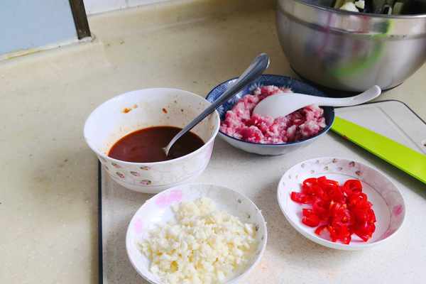 3.大蒜去皮切成蒜末,辣椒清洗幹凈切成小粒,肉餡加入1勺料酒和少許的胡椒粉攪拌均勻,這樣可以去腥,玉米淀粉加入糖、醋、生抽、鹽攪拌均勻,