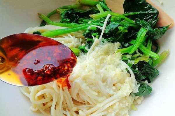 主料:黃豆芽金針菇克、菠菜200克輔料:香油適量、鹽適量、鮮味汁(可以用生抽)油潑辣子油、麻油、大蒜2瓣、白糖適量、少許香醋