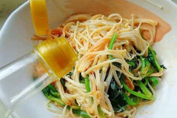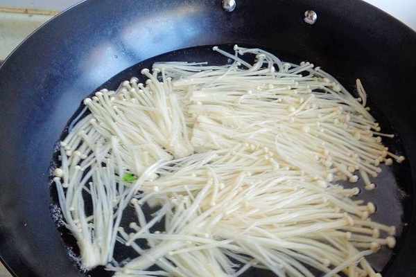 2、撈出來以後立刻下到涼水裡過涼,撈出擠幹水分以後切段,把金針菇去根部洗凈,也是下到開水裡,煮1分鐘左右撈起來,過涼水撈起來瀝幹水分
