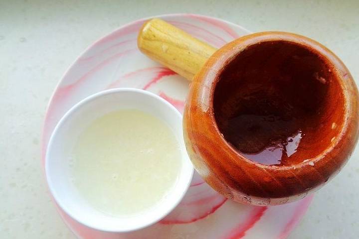 3、大蒜去皮用搗蒜器搗成蒜泥,這樣可以加少許涼開水拌一拌,做成蒜味汁;做調味汁,取一小碗,加涼開水和鹽、白糖拌均勻.