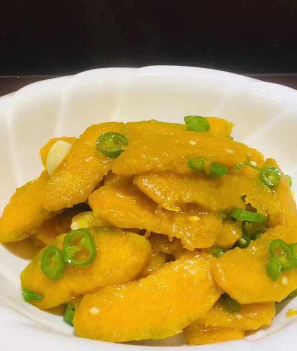 南瓜切薄片,不要太厚,這樣容易入味,如果時間充足可以切得有點薄。來一個青椒做點綴,幾個大蒜片,炒的時候盡量少放水,這樣口感會好一些。