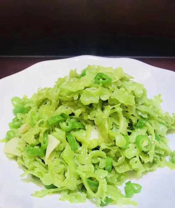 苦瓜切超級薄片,用鹽醃制十分鐘,用手用力揉苦瓜,擠出水分。等苦瓜水分擠幹後,鍋中放少許油,放苦瓜幹煸,炒斷生後放青椒和大蒜爆炒一兩分鐘即可。