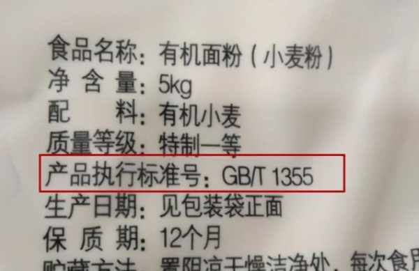 中筋面粉,這種面粉也是我們日常生活中最經常見到的,北方人喜歡吃面食,在傢裡面經常做包子、餃子、餡兒餅,買中筋面粉的時候也要看一下執行標準,是GB/T1355,“GB”是國標的意思,有1355這4個數字,當然也是符合我們國傢標準的好面粉。