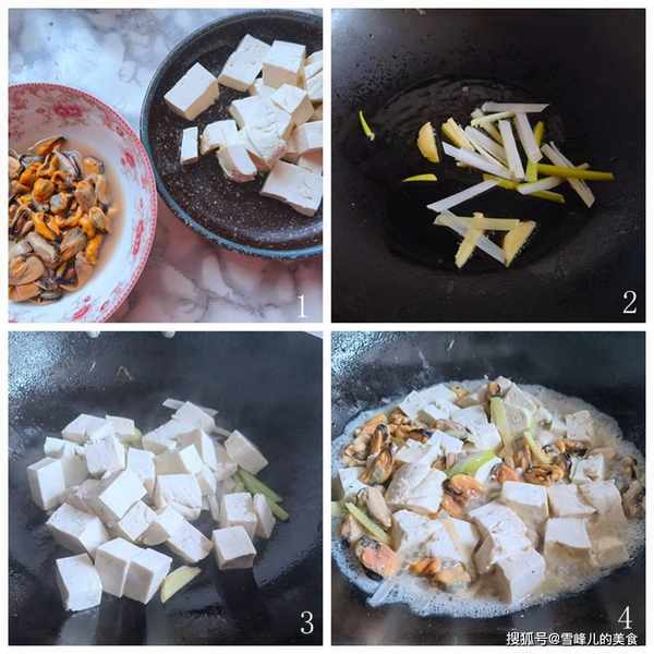 1,海虹蒸熟,去掉外殼留裡面的海虹肉,豆腐切成小塊,蔥薑切絲。