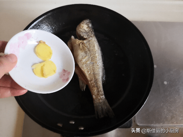 2. 將鱸魚的一面煎至金黃後翻面將另一面也煎至金黃, 加入幾片薑;