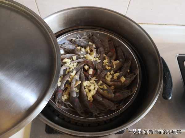 4. 燒鍋開水, 將蒜蓉蝦盤蒸鍋中大火蒸上五分鐘將蝦蒸熟;