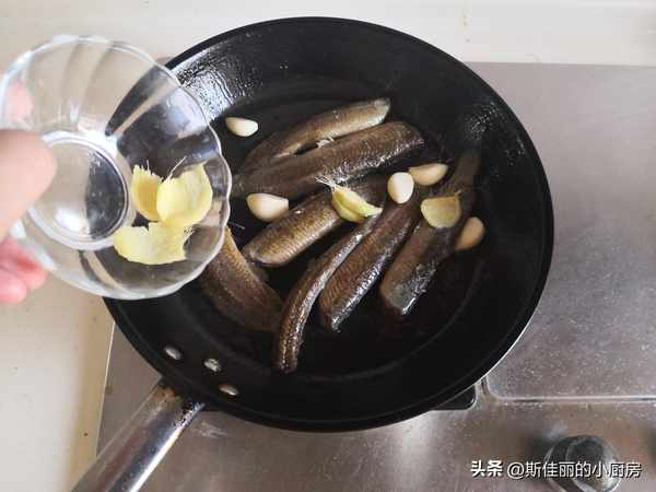 2. 將泥鰍煎至雙面金黃後加入薑片進鍋繼續煎一下;