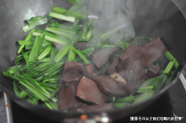 2、起鍋燒油,放入豬血塊,小火翻炒一會兒,炒至表面顏色焦黃,這樣味道更香,沒有腥味。然後倒入韭菜段,大火翻炒1分鐘。韭菜斷生後加適量食鹽,翻炒均勻後即可出鍋。