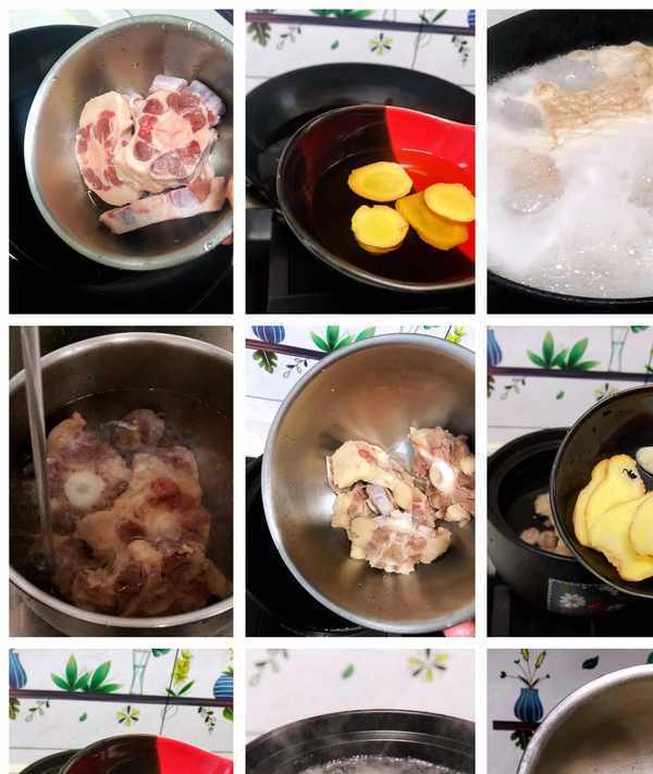 1??洗凈的牛尾骨冷水下鍋,加入2勺料酒,4勺薑片,大火燒開煮出血沫。用笊籬撈出,用清水沖洗幹凈瀝幹水份備用。