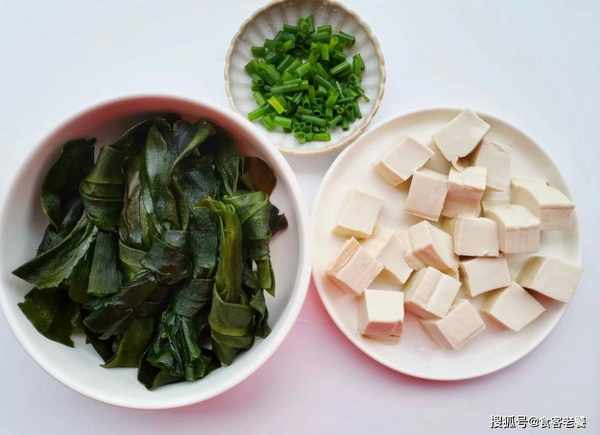 1取海帶結洗凈,豆腐切小塊,蔥切成蔥花,放在一旁備用。