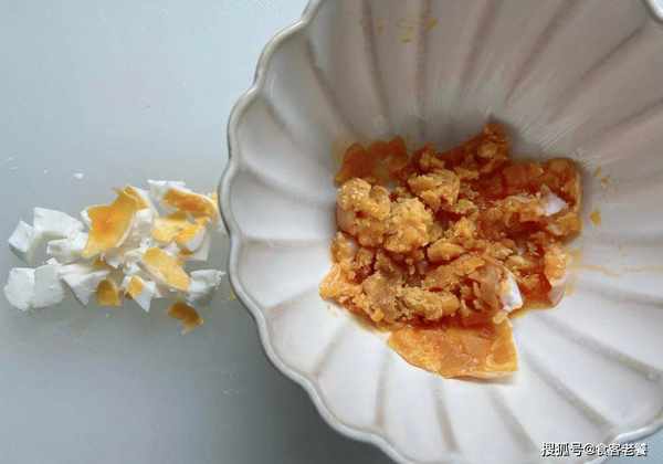 2取咸蛋剝好後取用蛋黃,用勺子壓成咸蛋黃泥,放在一旁備用。