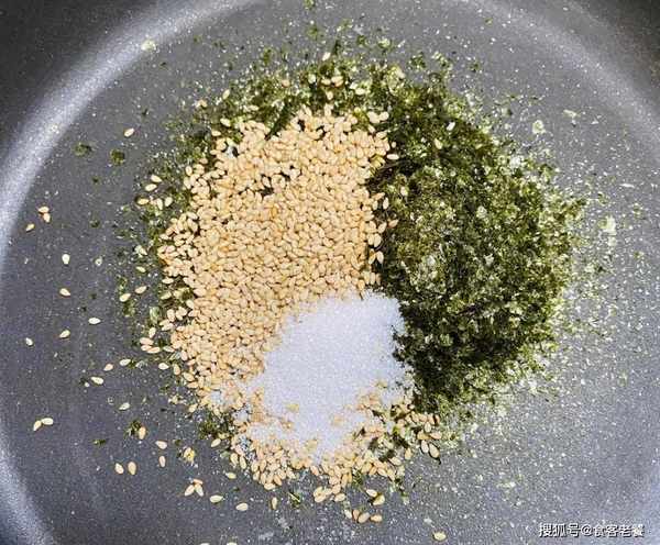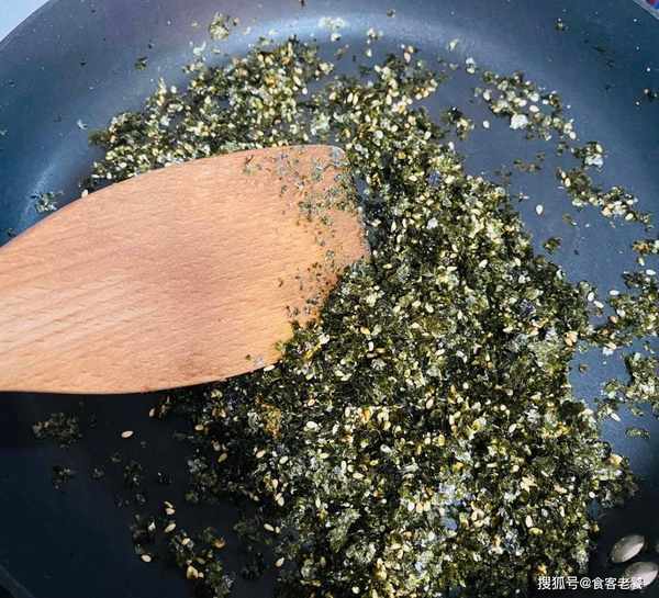 1鍋中倒入紫菜碎、芝麻、白糖小火翻炒3分鐘。