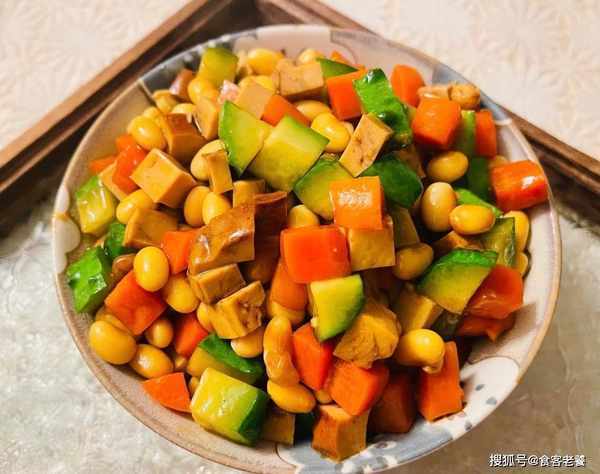 2取豆幹、黃瓜、胡蘿卜洗凈切丁。熱鍋冷油,先下入胡蘿卜丁煸炒出香味,再倒入黃豆炒制,加入生抽提鮮,再放入黃瓜、豆幹,擠入蠔油翻炒均勻,出鍋前淋入香油即可。