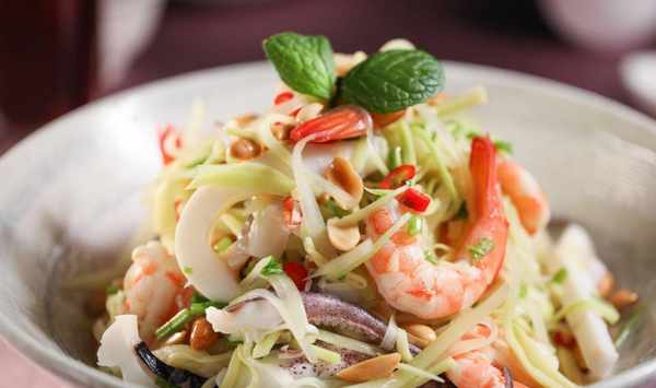 醃漬後青木瓜、青芒果絲拌入煮熟鮮蝦與軟絲,再混合魚露、檸檬汁、辣椒末及蒜味花生等佐料,酸辣風味十分開胃,口感清爽無負擔。