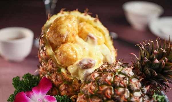 金黃色蝦仁香酥彈牙,搭配獨門醬料混合芒果醬、沙拉醬、鳳梨、哈密瓜及醃漬番茄制作,綜合多種水果,滿滿的維他命C、口感非常清爽。