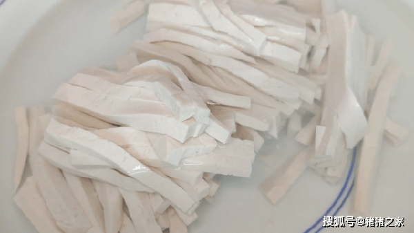 2.準備一塊嫩豆腐或者內脂豆腐,先切成片,再切成條,因為豆腐比較嫩,切的時候一定要小心一點,別把豆腐弄碎瞭。再把切好的豆腐放入溫水裡面,這樣可以去除豆腐一部分的豆腥味,讓它浸泡10分鐘。