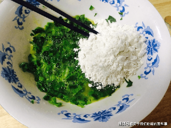 1、萵筍葉洗幹凈,瀝幹水分後用刀切碎,盡量碎一點。雞蛋打入碗中,加入適量食鹽、面粉、清水,攪拌均勻。放入切碎的萵筍葉,再次攪拌均勻。