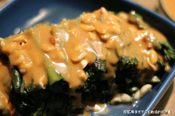 3、把花生醬料汁澆在萵筍葉上,再撒上花生碎,用筷子翻拌均勻後即可食用。