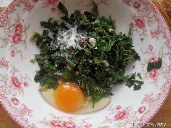 第五步:把切好的曲曲芽放入碗中,打入一個雞蛋,加入適量的鹽調味。