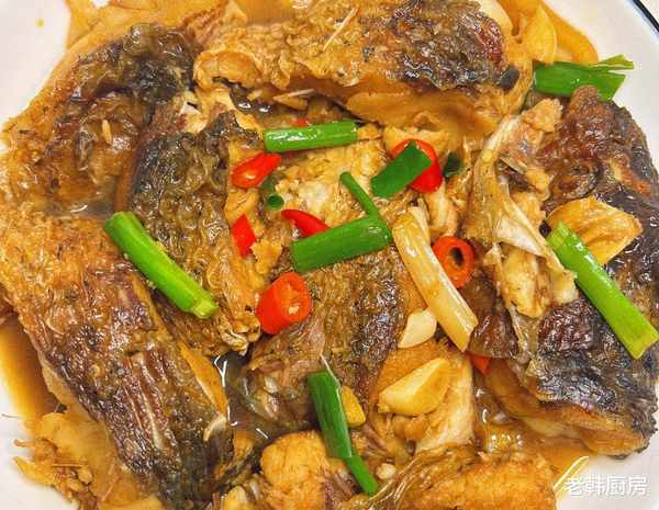 鍋裡油燒熱,油要多一點哦~加入鹽,把魚塊碼進去煎,這一步可不能著急,要把魚煎透,大約5分鐘;魚翻面,繼續煎4-5分鐘,加入生薑大蒜小米辣